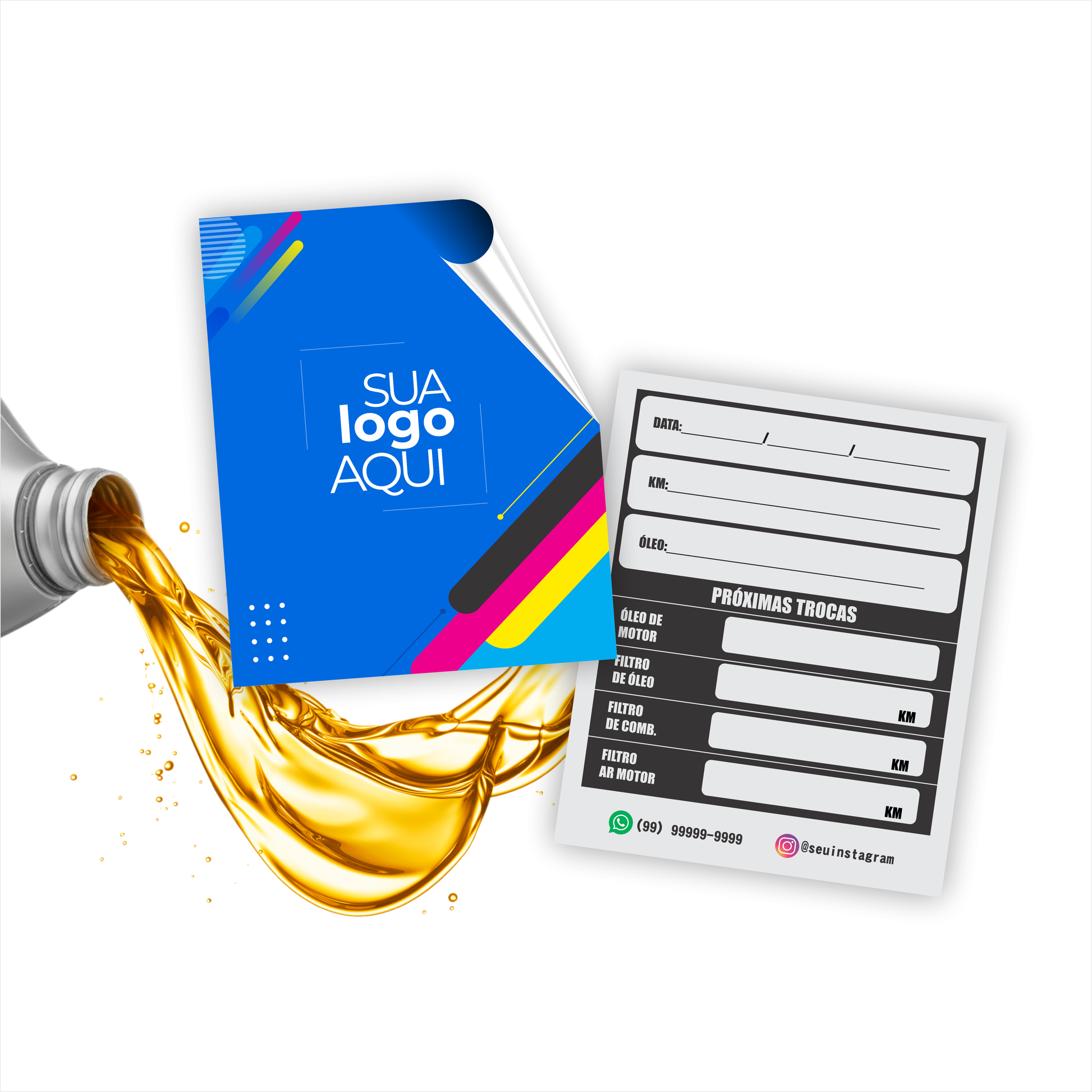 Com design personalizável, permitem incluir logotipo, contatos e campos para data e quilometragem da próxima troca. A escrita pode ser feita com caneta permanente, e a aplicação é rápida, limpa e sem resíduos.