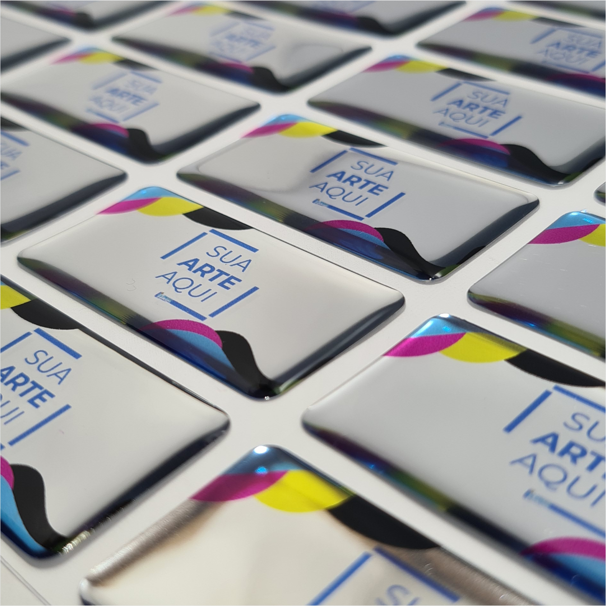 Com impressão digital de alta definição e recorte eletrônico preciso, nossos adesivos resinados oferecem resistência superior e aparência profissional para diversas finalidades.