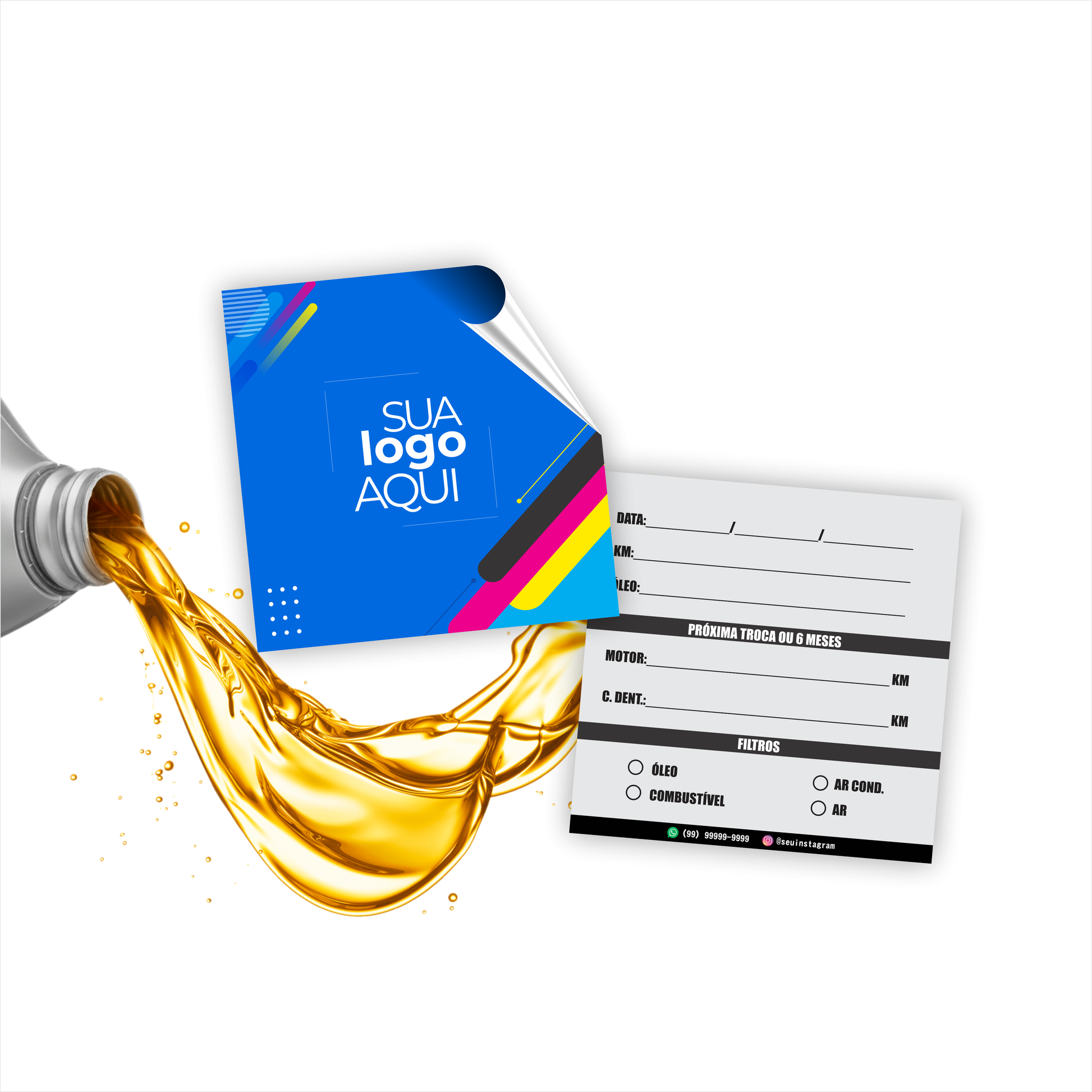 Com design personalizável, permitem incluir logotipo, contatos e campos para data e quilometragem da próxima troca. A escrita pode ser feita com caneta permanente, e a aplicação é rápida, limpa e sem resíduos.