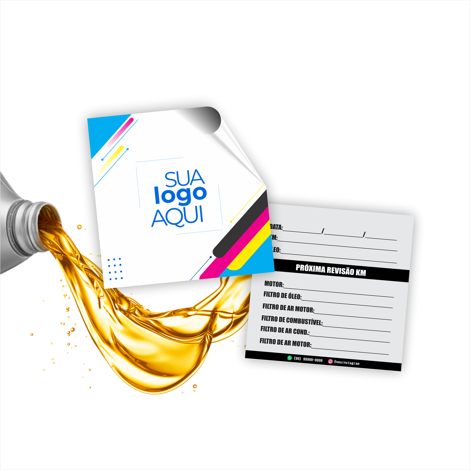 Com design personalizável, permitem incluir logotipo, contatos e campos para data e quilometragem da próxima troca. A escrita pode ser feita com caneta permanente, e a aplicação é rápida, limpa e sem resíduos.